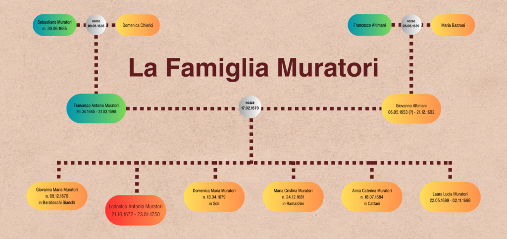 La famiglia Muratori poteva contare su una condizione economica sufficientemente florida per l’epoca. Il padre, Francesco Antonio (1645-1698), oltre a possedere diversi terreni sia a Savignano sul Panaro che nelle Basse Inferiori di Vignola, gestiva una bottega artigiana per la produzione di manufatti e utensili in rame. Per diversi anni, inoltre, Francesco Muratori ha ricoperto l’incarico di massaro per la Comunità di Vignola, riscuotendo le tasse, effettuando gli acquisti di beni comuni e presiedendo il Consiglio. La madre, Giovanna Altimani (1653-1692), apparteneva a una delle famiglie più in vista di Vignola, che possedeva diverse case di proprietà. Lodovico Antonio era l’unico figlio maschio della coppia, oltre a cinque sorelle, una delle quali morta in tenera età.