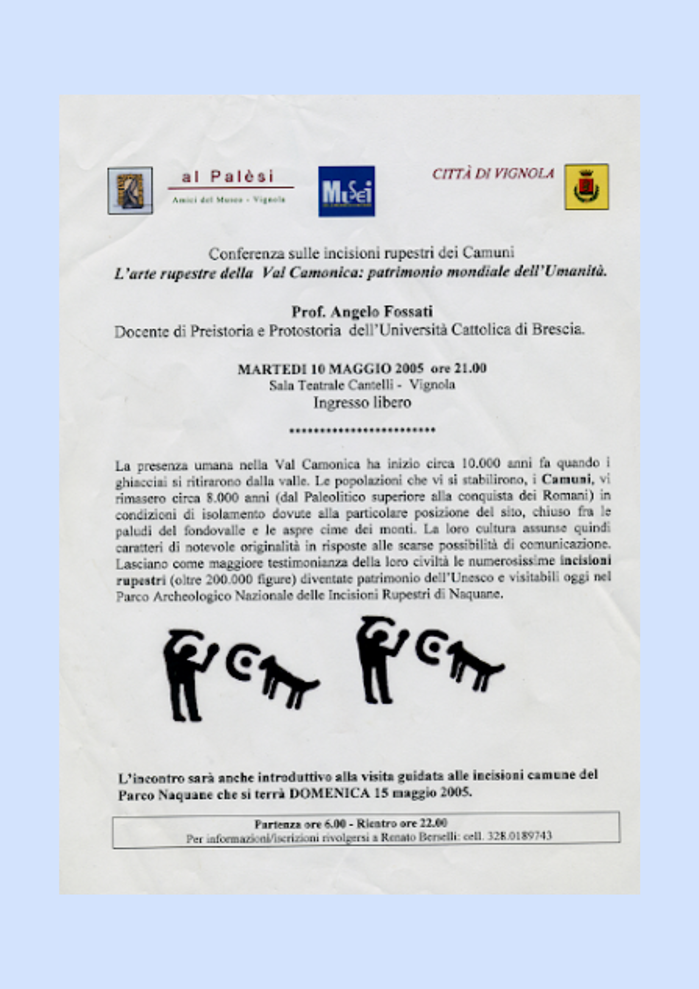 Viene organizzata una visita in Valcamonica, nei luoghi delle antiche incisioni camune, nel parco Naquane. Il viaggio, che si effettua il 15 Maggio, è preceduto da una conferenza del prof. Angelo Fossati, docente di Preistoria e Protostoria dell’Università cattolica di Brescia, su “L’arte rupestre della Val camitica: patrimonio mondiale dell’Umanità”. All’interno delle sale del Museo, nell’ambito della “Festa della fioritura”, viene allestita una mostra, sull’arte rupestre. Sono proposte ed effettuate conferenze, anche presso la Biblioteca di Spilamberto, su tematiche di storia locale e presentate diapositiva di viaggi ed escursioni, come momenti, oltre che di conoscenza, di socializzazione e crescita del gruppo nonché di promozione del Museo.