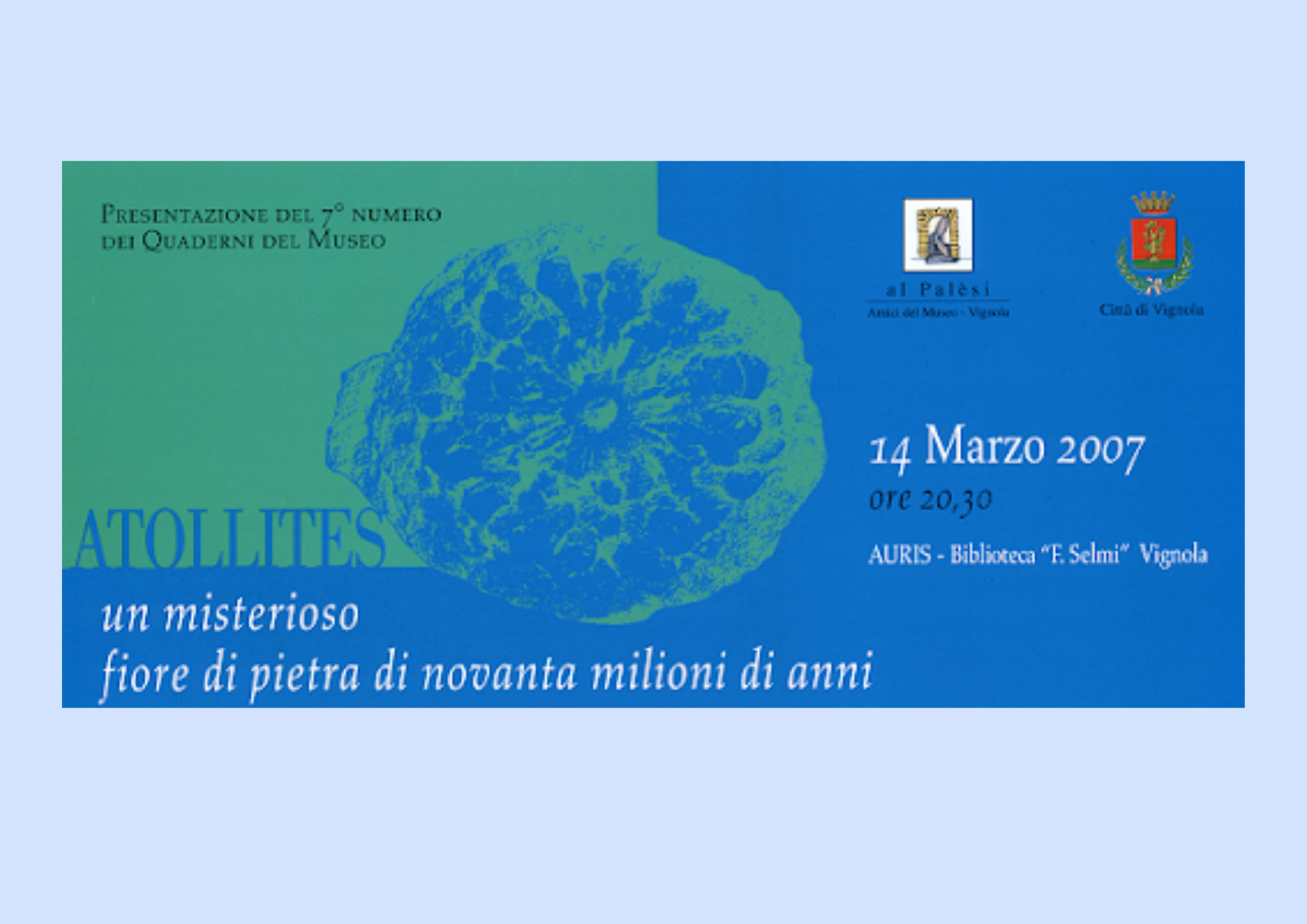 Esce la pubblicazione dei Quaderni dal titolo “Atollites. Un misterioso fiore di pietra di 90 milioni di anni” ed è organizzato un convegno dedicato al misterioso fossile, trovato da un appassionato ricercatore: Vittorio Bega. Il fossile, dopo essere stato studiato presso l’Università di Modena e di Reggio Emilia, entra a far parte della collezione vignolese. Si tratta di un olotipo: esemplare tipo su cui si basa la descrizione di una nuova specie.