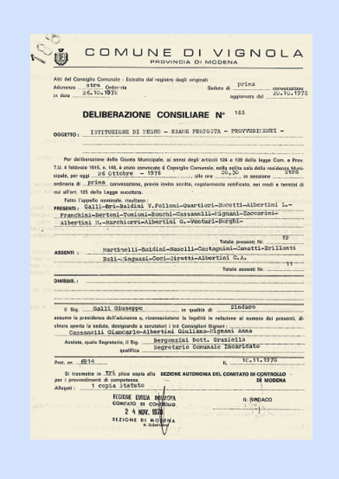 Nasce così, con delibera consiliare n°188 di quello stesso anno, il Museo Civico che avrà sede provvisoria presso il Municipio di Vignola. Viene altresì approvato lo statuto della nuova istituzione.
