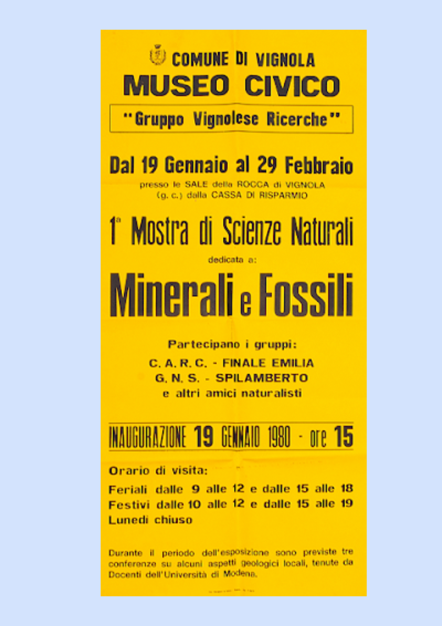 Il 16 Maggio 1978 nasce il G.V.R. (Gruppo Vignolese Ricerche) nato per volontà di alcuni volontari accomunati dalla passione per lo studio della natura e, in particolare, dalla mineralogia, paleontologia ed archeologia. Lo scopo dell’associazione è la promozione e la realizzazione di iniziative culturali, riguardo a queste discipline. Tra questi appassionati spicca la Maestra Augusta Redorici Roffi che resterà per oltre un trentennio una delle colonne portanti del Museo e delle sue attività didattiche. In questo periodo l’Associazione non ha ancora una sede fissa e di volta in volta, per le assemblee, utilizza i locali dell’ex-biblioteca comunale presso il Municipio di Vignola, i locali delle scuole elementari di Viale Mazzini e le sale della Rocca per deposito di materiali e mostre. La sede fissa diventerà in seguito, condivisa con altri gruppi, Palazzo Barozzi dove i volontari portano ciò che trovano nel corso delle loro ricerche lungo i fiumi e i torrenti (Panaro, Guerro, Tiepido, Rio Faellano), sui calanchi marnosi e scagliosi, nei campi appena arati delle nostre colline, per condividere con la cittadinanza questi importanti reperti fossili e mineralogici i quali costituiranno il primo nucleo del Museo, che sarà approvato dall’Amministrazione comunale nell’ottobre 1978, su istanza del gruppo di ricercatori.