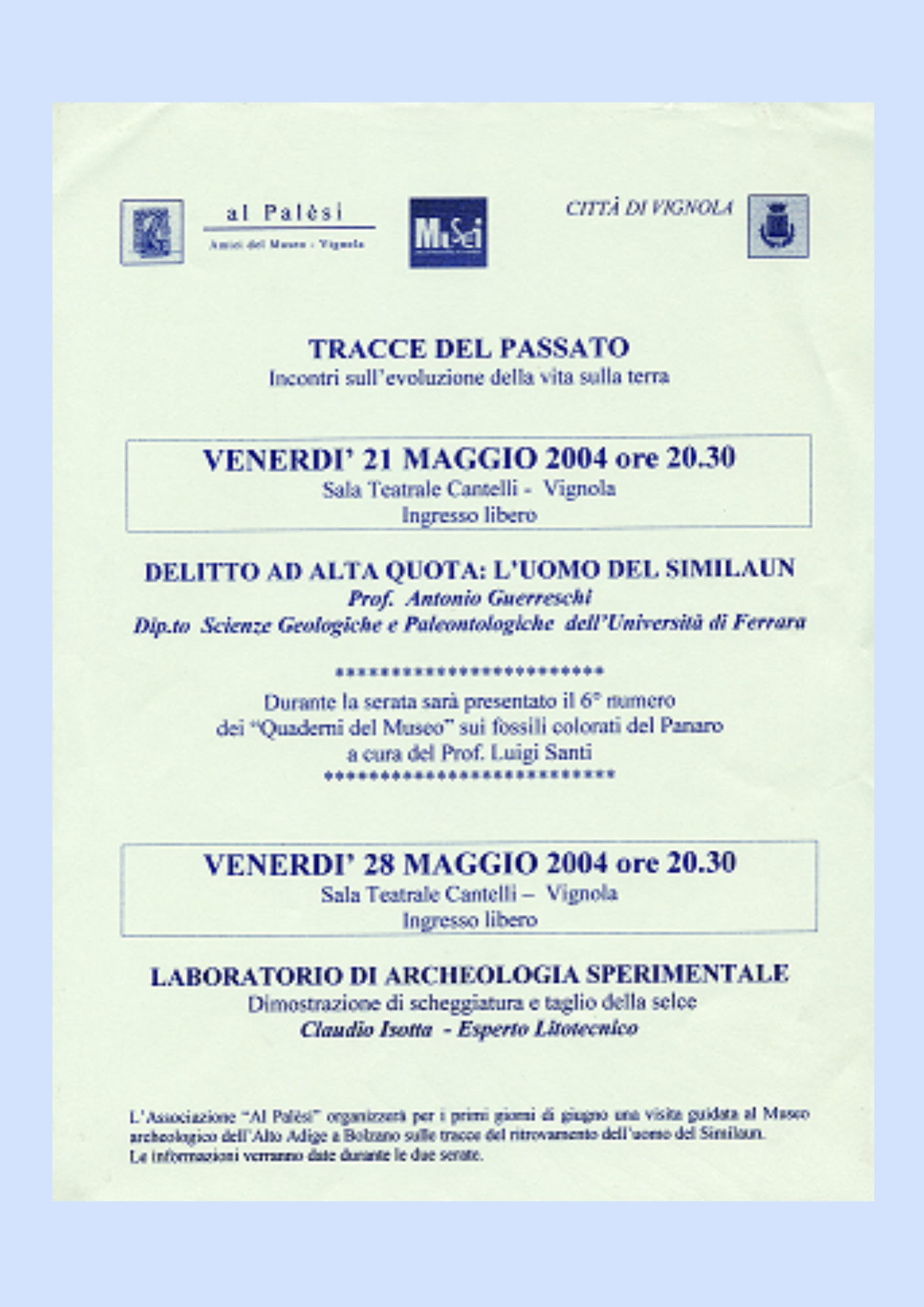 Il 2004 è un anno dedicato all’evoluzione dell’uomo, terzo percorso del Museo. Il 14 Maggio viene proiettato un video sulla mummia del Similaun, con commento e approfondimento della prof. Angela Giansante: le settimane successive (21 e 28 Maggio) nella sala del teatro Cantelli il prof. Guareschi tiene una conferenza dal tema “L’uomo primitivo” e il litotecnico Claudio Isotta riproduce armi e strumenti litici, usati dall’uomo primitivo e costruiti con le stesse tecniche e materiali. Si organizza anche una gita a Bolzano, per visitare il Museo e la famosa mummia del Similaun. Nell’autunno si conclude l’attività sulla stessa tematica che vede per il giorno 24 Settembre, presso la sala Cantelli, una pubblica conferenza sullo scavo di ripa Tagliente, tenuta dalla dott. Federica Fontana dell’Università di Ferrara.